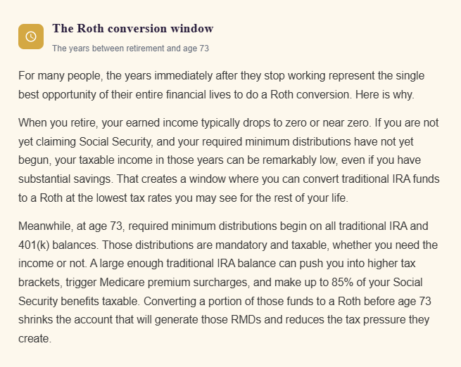 Determine which years offer the lowest tax rates and the most room in lower brackets. For many people this is the gap between retirement and age 70 when Social Security begins, and before age 73 when RMDs kick in.