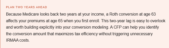Tax laws change, account balances shift, and life circumstances evolve. A conversion strategy that made sense at 63 may look different at 67. Annual reviews with a CFP keep the strategy calibrated to your actual situation.