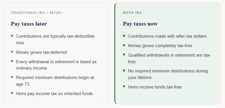 The core question is always the same: is it better to pay the tax now, or later? The answer depends on whether your tax rate today is lower, higher, or the same as it will be in retirement.